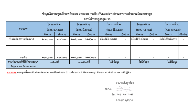 ข้อมูลกองทุนเพื่อการสืบสวนสอบสวนการป้องกันและปราบปรามการประทำผิดทางอาญา ของ สภ.กุดบาก